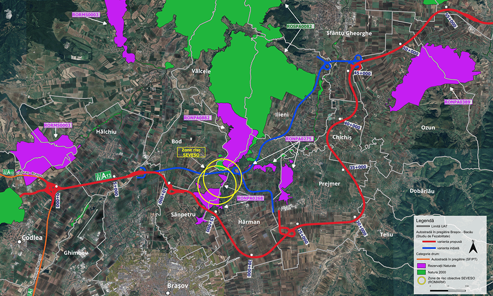 - devierea traseului cu aproximativ 12 kilometri în zona poligonului CARFIL (UAT Hărman, județul Brașov), unde se desfășoară teste pirotehnice și unde regimul de siguranță limitează amplasarea infrastructurii rutiere