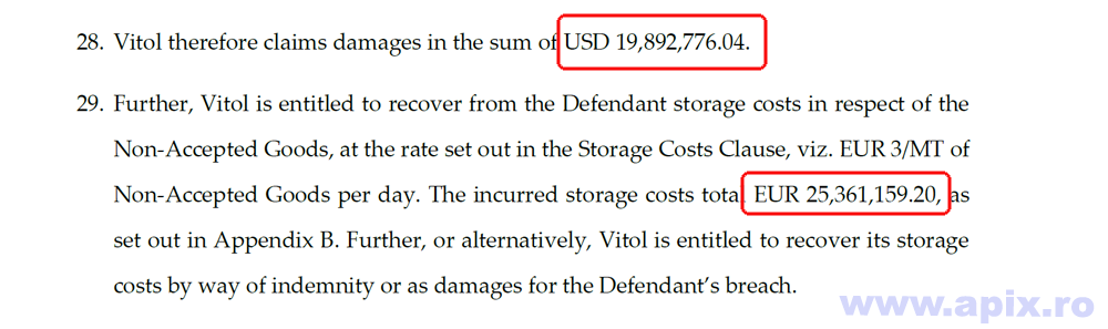 În cererea de judecată depusă de Vitol la Londra, elvețienii invocă că Iașul ar trebui să-i plătească aproape 50 milioane de euro: daune de 20 milioane de euro pentru cărbunele contractat dar care nu a fost recepționat (aproape 70.000 tone) și alte 25 milioane de euro care ar reprezenta „costuri de depozitare” în zona liberă Constanța – Vitol susține că a adus cărbunele, dar Primăria nu l-a preluat.