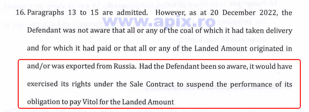 În același timp, municipalitatea spune că Vitol nu a furnizat niciodată un certificat de origine care să clarifice neîndoielnic proveniența reală a mărfii. Mai mult, instituția susține că elvețienii „trebuie să fi fost conștienți” că livrează combustibil interzis pe piața europeană. Suplimentar, avocații invocă faptul că, în baza unui acord anterior celui disputat, Vitol a livrat cărbune la Iași în special din Rusia, încărcat tot în portul Taman.