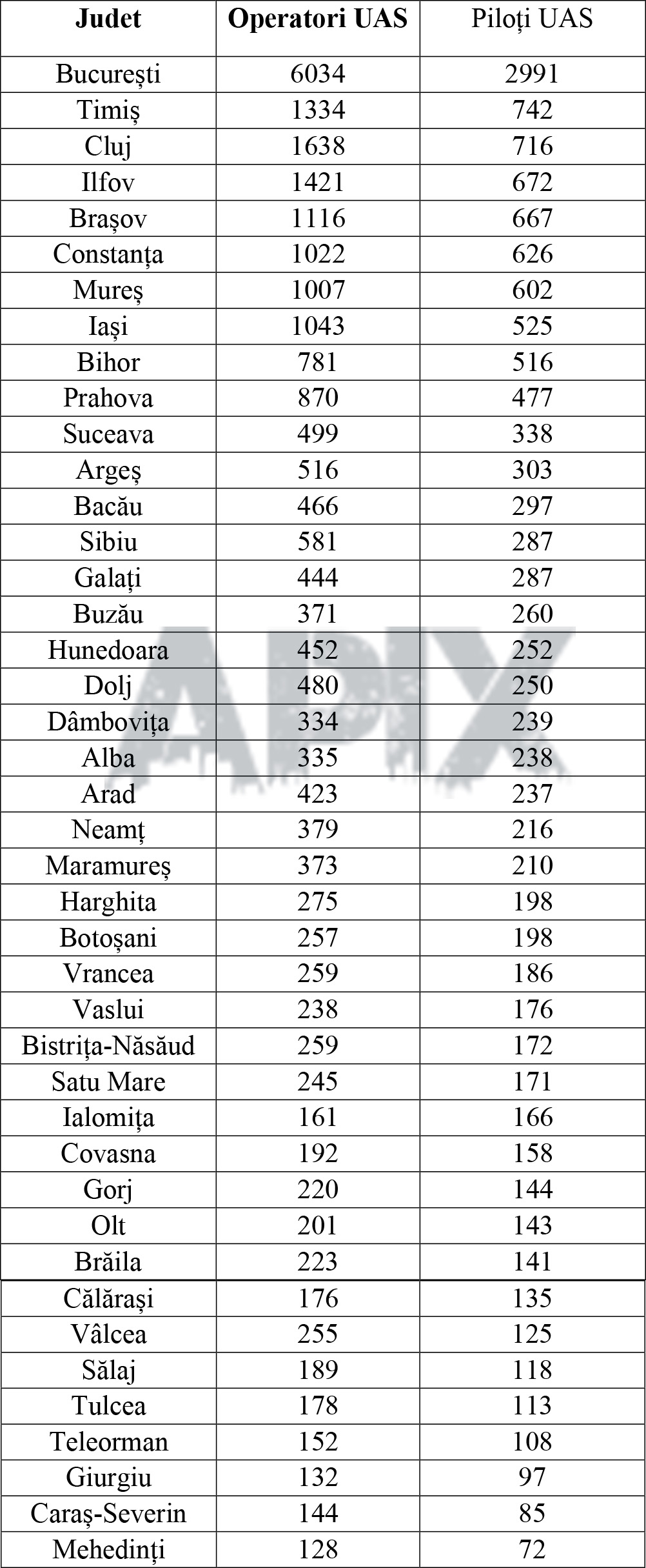 Bucureștiul este urmat de județele Timiș (742), Cluj (716), Ilfov (672), Brașov (667), Constanța (626), Mureș (602), Iași (525) și Bihor (516). Situația pe fiecare județ, atât în cazul operatorilor, cât și a piloților, poate fi consultată la finalul acestui articol.