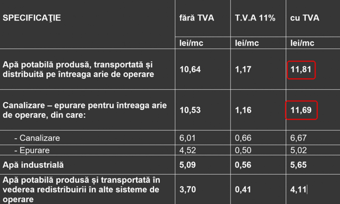 Începând cu 1 ianuarie 2026, prețul unui metru cub de apă va fi 23,5 lei comparativ cu 20,25 lei în prezent. În comunicatul ApaVital primit la redacție, este detaliat prețul pe fiecare serviciu în parte: