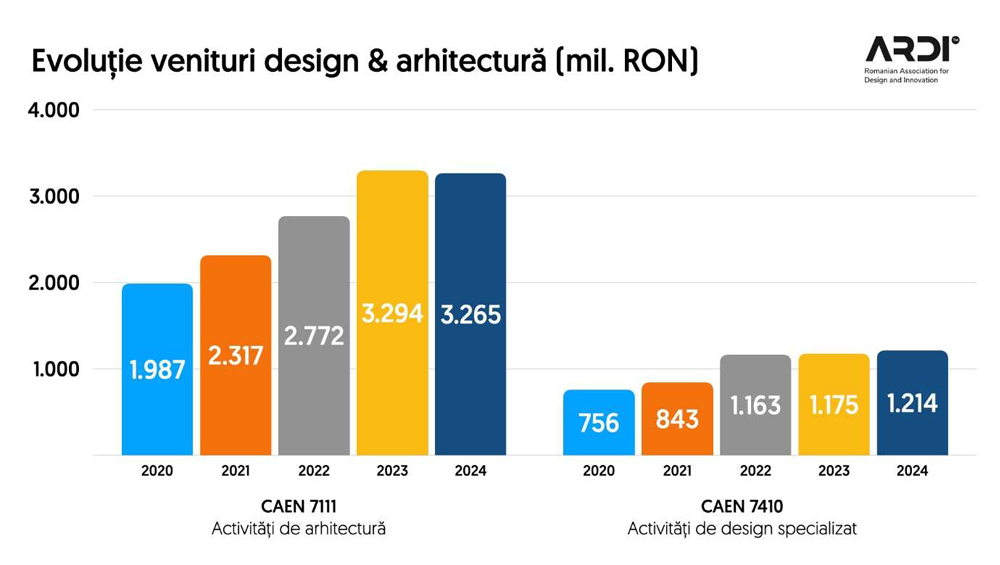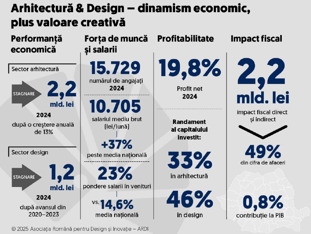 În paralel, sectorul arhitectură și design continuă să înregistreze performanțe financiare solide, cu o profitabilitate de 19,8% și salarii medii cu 37% peste media națională. Cu un impact fiscal total de 2,2 miliarde lei, acesta contribuie la modernizarea investițiilor publice și private și la competitivitatea economiei românești.