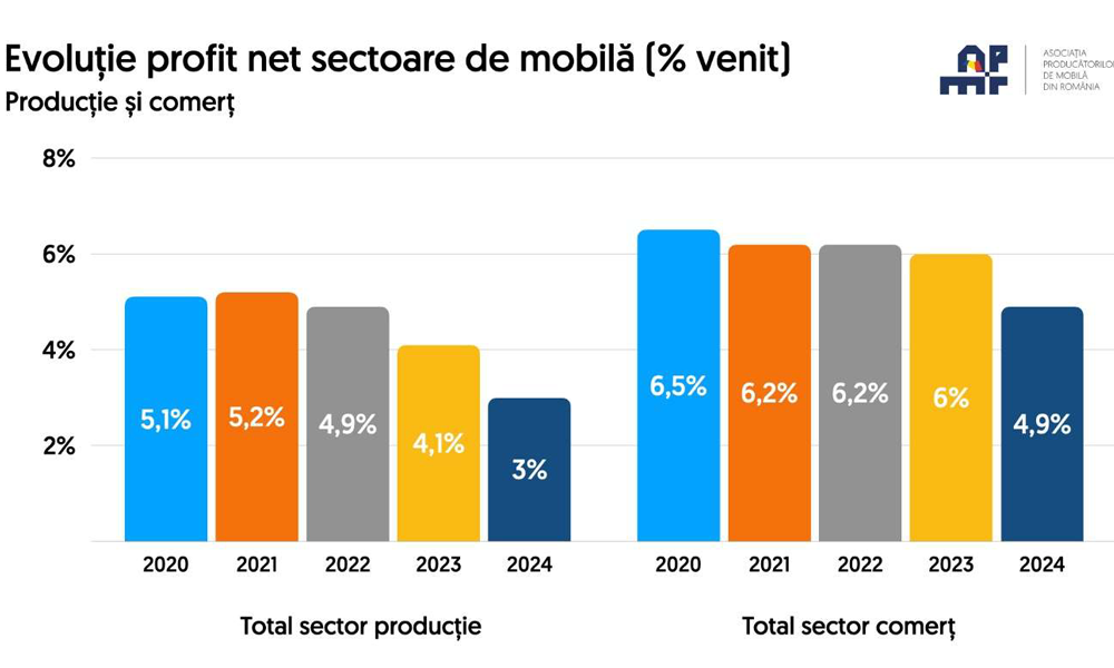 - Profitabilitate netă: 3,6% în sectorul de mobilă, 19,8% în arhitectură/design