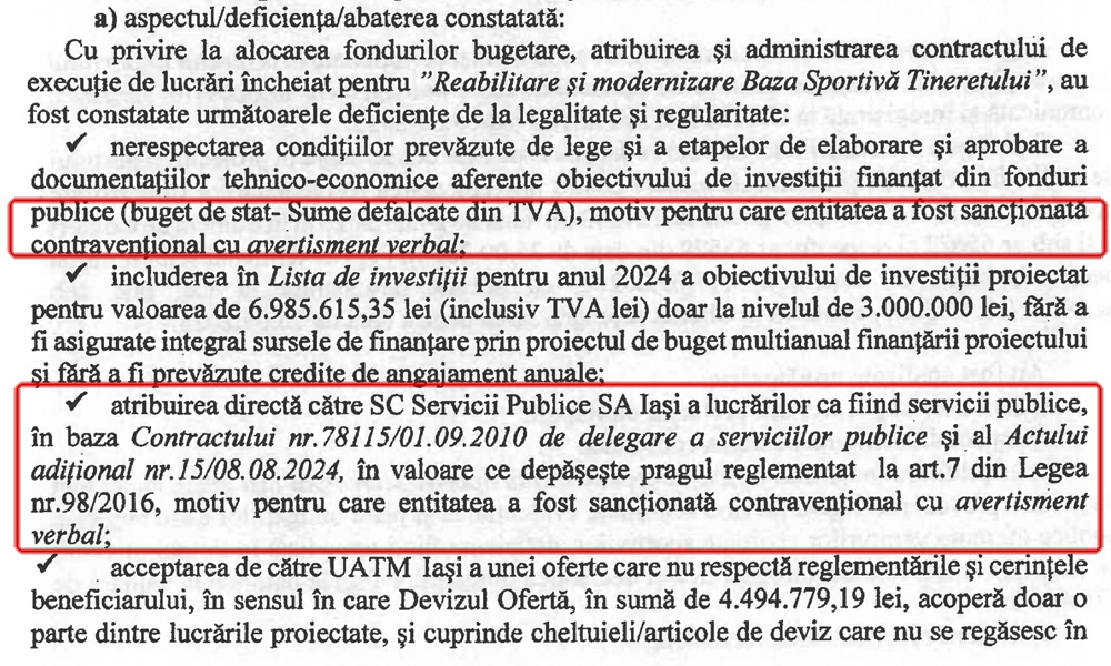 Curtea de Conturi a descoperit mai multe abateri de la cadrul legal în modul în care Primăria Iași a gestionat o investiție publică: reabilitarea bazei sportive Tineretului. Printre nereguli, se numără atribuirea directă a lucrărilor (fără licitație) în favoarea unei societăți proprii și efectuarea de plăți fără o bază reală.