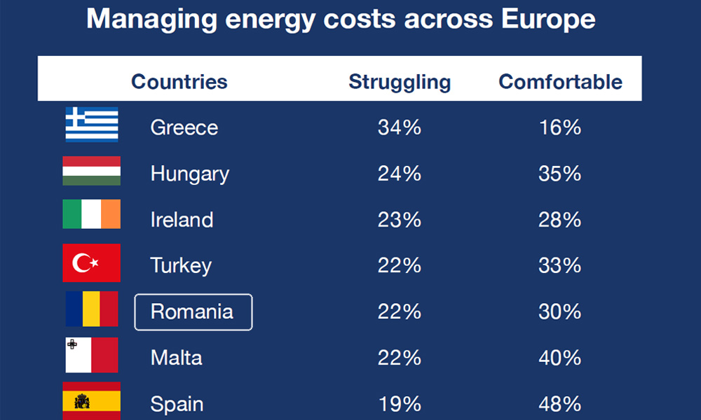 Doar 40% dintre români spun că se simt confortabil cu cheltuielile legate de locuință (rată, chirie, utilități), sub media europeană de 45%. Situația este și mai tensionată în cazul energiei: doar 30% se declară confortabili cu plata facturilor la energie, comparativ cu 45% la nivel european. Situația este și mai tensionată în cazul energiei: doar 30% se declară confortabili cu plata facturilor la energie, comparativ cu 45% la nivel european, iar 22% spun că se confruntă cu dificultăți în acest sens (media UE: 16%).
