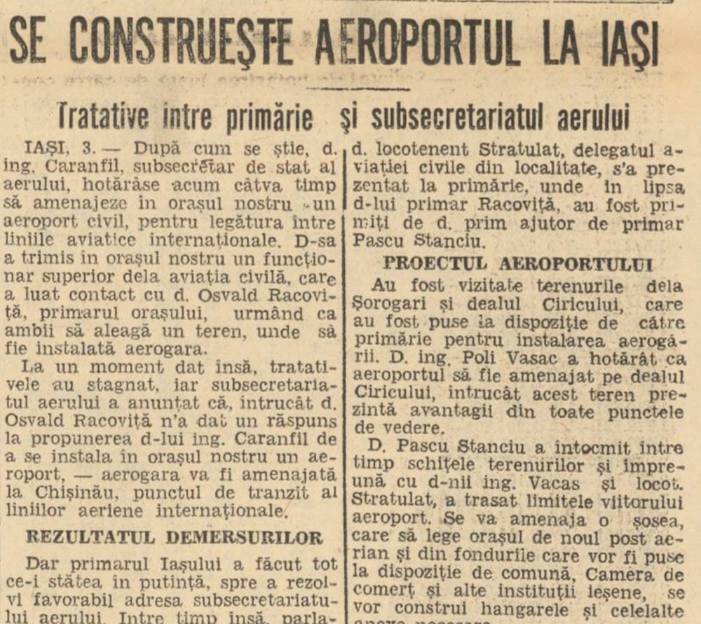 „Dar primarul Iaşului a făcut tot ce-i stătea in putinţă, spre a rezolva favorabil adresa subsecretariatului aerului. Intre timp insă, parlamentarii basarabeni au intervenit pe lângă d. Caranfil, ca proectatul aeroport să fie instalat la Chişinău, iar nu la Iaşi. Subsecretarul aerului a fost convins de parlamentarii basarabeni şi ca scuză a declarat că numaid. Osvald Racoviţă este vinovat, că aerogara n’a fost amenajată în oraşul nostru. Şefii autorităţilor locale au făcut însă noui demersuri la centru, arătând că primarul Iaşului, a răspuns imediat la adresa d-lui ing. Caranfil şi deci d-sa nu poate fi învinuit, că a neglijat să ducă la bun sfârşit un proiect menit să învioreze viaţa economică a capitalei Moldovei. In cele din urmă, s’a decis să se înfiinţeze în oraşul nostru un aeroport civil în condiţiunile cerute anterior de subsecretariatul aerului”, relata publicația „Dimineața”.
