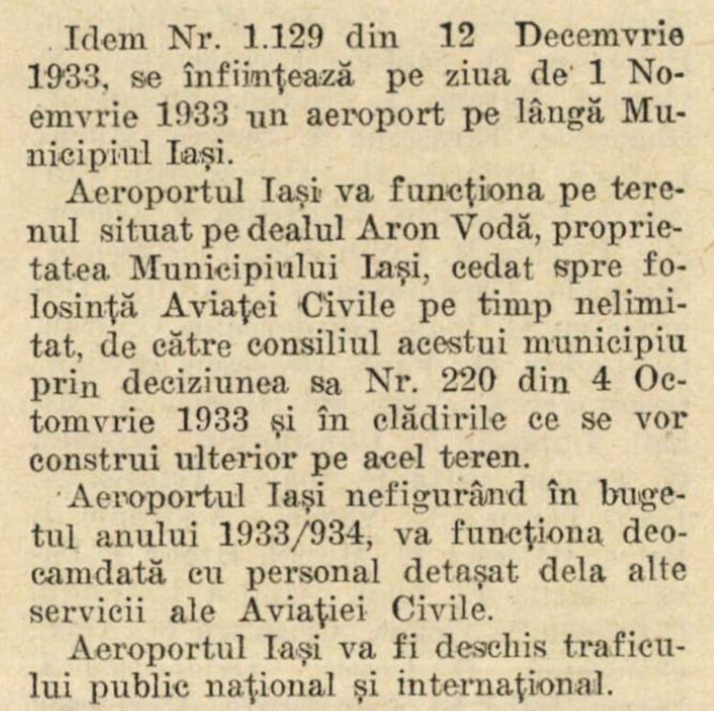 „Se înființează pe ziua de 1 Noiemvrie 1933 un aeroport pe lângă Municipiul Iași. Aeroportul Iași va funcționa pe terenul situat pe dealul Aron Vodă, proprietatea Municipiului Iași, cedat spre folosință Aviației Civile pe timp nelimitat de către consiliul acestui municipiu prin deciziunea sa nr. 220 din 4 Octomvrie 1933 și în clădirile ce se vor construi ulterior pe acel teren. Aeroportul Iași, nefigurând în bugetul anului 1933/934, va funcționa deocamdată cu personal detașat de la alte servicii ale Aviației Civile. Aeroportul Iași va fi deschis traficului public național și internațional”.