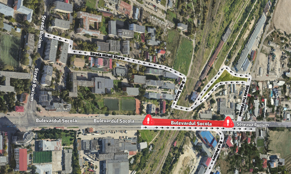 „Având în vedere că se prevăd lucrări la pasajul Socola, sunt impuse restricții de tonaj la 7,5 tone, vehiculele de mare tonaj care tranzitează zona vor fi dirijate pe rute ocolitoare. Calea de acces temporară va avea caracter de drum cu sens unic – str. Trei Fântâni, către intersecția cu DN 28. Restul tronsonului, zona CF 605, str. Mihail Sturza până la intersecția cu str. Bucium va fi tranzitat de autovehicule cu masă mai mică de 7,5 tone, drum cu sens unic”, se arată în autorizația 110/2026 emisă de Primăria Iași.