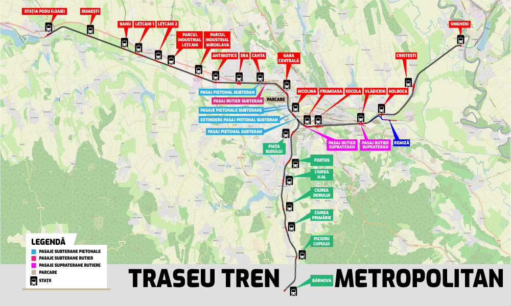 În schimb, reabilitări de gări existente vor fi în situația punctelor de oprire Podu Iloaiei, Lețcani, Gară Centrală, Nicolina, Socola, Cristești Jijia, Ciurea HM și Piciorul Lupului.